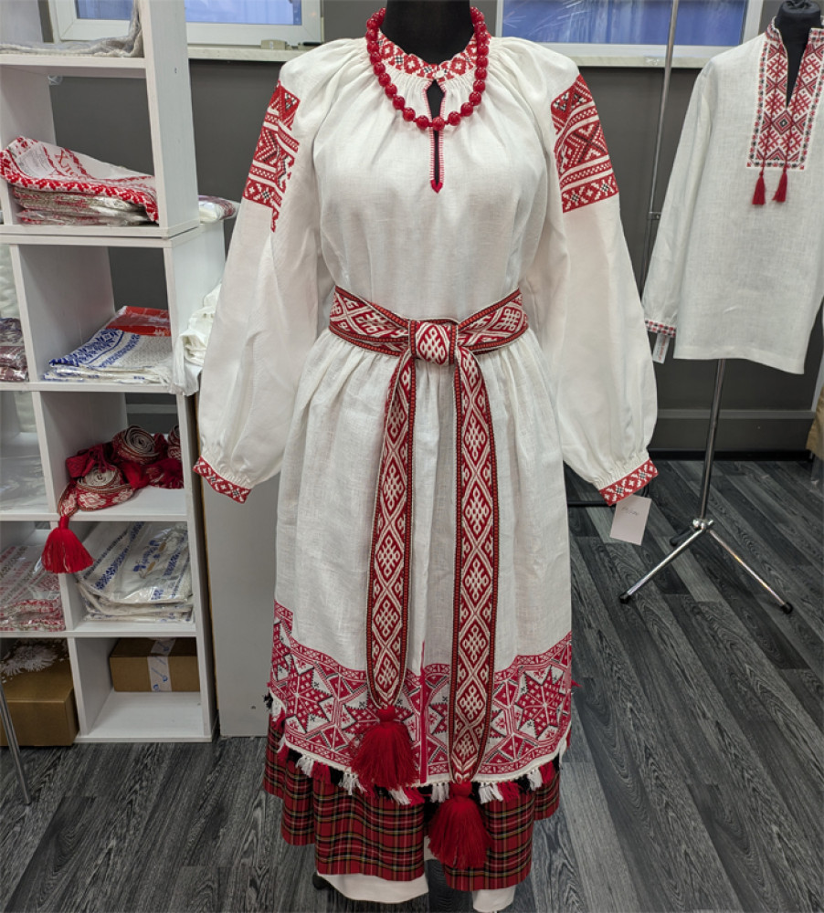 Цена с машинным передником 865-885 р. Комплектация костюма из пяти предметов: сорочка длинная Ружана, юбка (в ассортименте), передник ручной двойной с махрами, пояс шириной 5,5 см с кистями (в ассортименте), карали (в ассортименте).